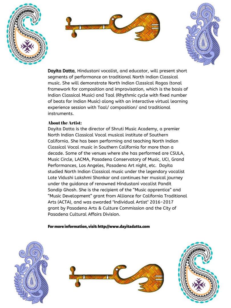 2. Pran Prathistha 6th Anniversary Celebration concert, Antelope Valley Hindu Temple, Antelope Valley, CA 3. Pasadena Art Night Festival, Pasadena Conservatory of Music, Pasadena, CA 4. "Following the Box exhibition" concert, Pacific Asia Museum, Pasadena, CA 5. Meera - Baavari Fearless Love of a Rajput Princess, Harvey Auditorium, Bakersfield, CA 6. Shyama, a dance drama by Nobel laureate Rabindranath Tagore, presented by Shakti Dance Company, James Armstrong Theatre, Torrance, CA 7. North Indian Classical Music, presented by Shruti Music Academy, Sanatan Dharma Temple, Norwalk, CA 8. Raga Essence performance at Pasadena ArtNight, City Hall, Pasadena 9. Raga Essence performance at UCI Claire Trevor, School of the Arts 10. Raga Essence performance at Pasadena ArtNight and Gilb Museum of Arcadia Heritage 11. "Rabindranath Tagore: A Celebration of His Music, Art and Poetry", presented by Shruti Music Academy in collaboration with Pasadena Central Library, Donald Wright Auditorium, 285 E. Walnut Street, Pasadena, CA 91101 12. "An Evening of North Indian Classical Music", presented by Shruti Music Academy, Pasadena Conservatory of Music, Pasadena, CA 13. "North Indian (Hindustani) Music Concert", presented by Shruti Music Academy, Ektaa Center, Irvine, CA 14. "Parampara Music Concert", presented by Music Circle, Pasadena City College, Pasadena, CA 15. "North Indian (Hindustani) Music Concert", presented by Shruti Music Academy, Pasadena Conservatory of Music, Pasadena, CA 16. "An Evening of Classical Vocal and Violin", Chawla Residence, WestLake Village, CA 17. "Meeting the Masters" - North Indian Classical music by eminent vocalist Pandit Sandip Ghosh accompnaied by tabla maestro Pandit Abhijeet Banerjee and Dr. Gopal Marathe on Harmonium. A Joint collaboration of Shruti Music Academy and Pasadena Conservatory of Music, Pasadena, CA 18. "Raga Essence" - Indian Classical music with Dayita Datta, Jyoti Prakas, and Peter Jacobson, Pasadena Art Night, Pasadena Conservatory of Music, Pasadena, CA 19. "North Indian (Hindustani) Music Concert", presented by Shruti Music Academy, Pasadena Conservatory of Music, Pasadena, CA 20. "Meera - The Saint Poet," a production of Shakti Dance Company, James Armstrong Theatre, Torrance, CA 21. "North Indian (Hindustani) Music Concert," presented by Shruti Music Academy, Pasadena Conservatory of Music, Pasadena, CA 22. "Musical Tribute to legendary vocalist - Smt. Lakshmi Shankar," presented by Associated Students Inc., California State University, Los Angeles, CA 23. "Legacy of Lakshmi Shankar," presented by UCSB Raagmala and Dept. of Music, University of California, Santa Barbara, CA 24. "Meeting of the Masters," Ekta Mandir, presented by Dhwani Academy of Percussion Music, Phoenix, AZ